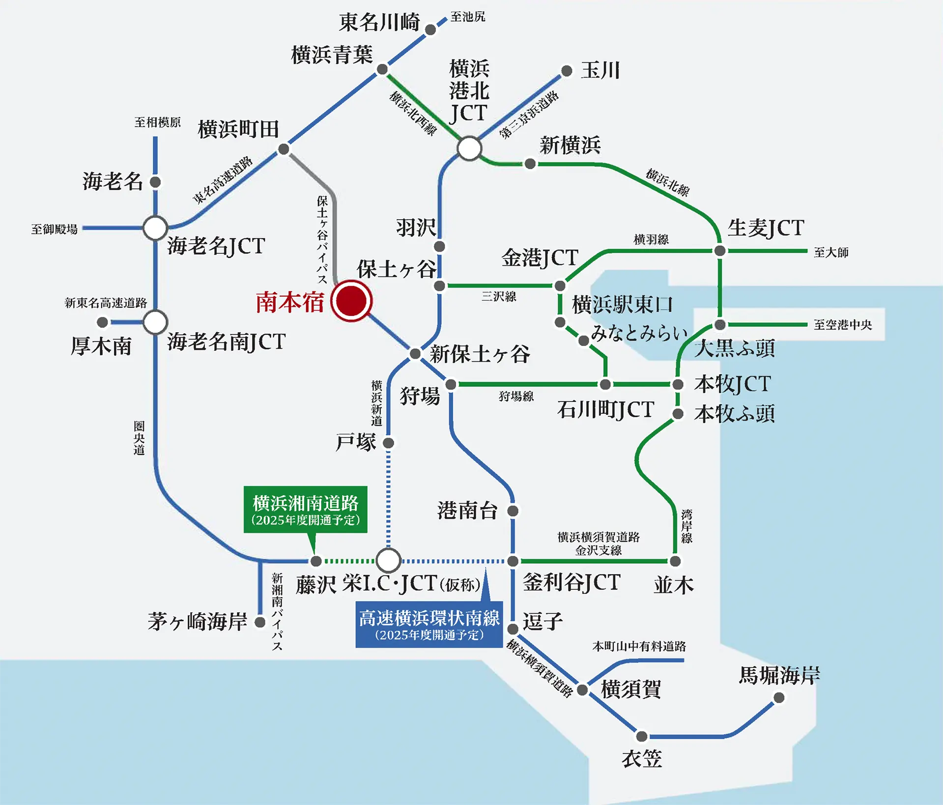 横浜新道「本村IC」まで車で約5分。東京方面・横浜駅方面・横須賀方面へ、スムーズにつながる快適なカーアクセスです。休日のドライブやレジャーも、思い立ったらすぐに出かけられる便利さが魅力です。