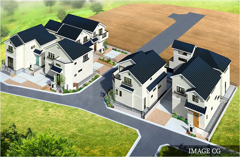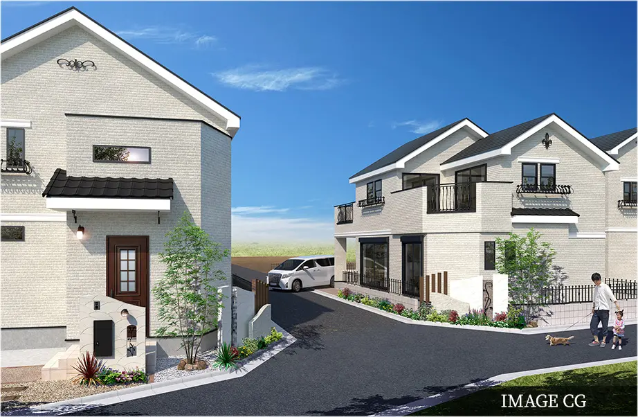 女性設計士チームによる細やかな視点から生まれた街並み。切妻屋根のリズムや白壁のやわらかな表情に、光と風を招き入れる工夫を重ねました。23区画それぞれの住まいが調和しながらも個性を放つ。街全体がやさしく心地よい空気に包まれる景観を描き出しています。