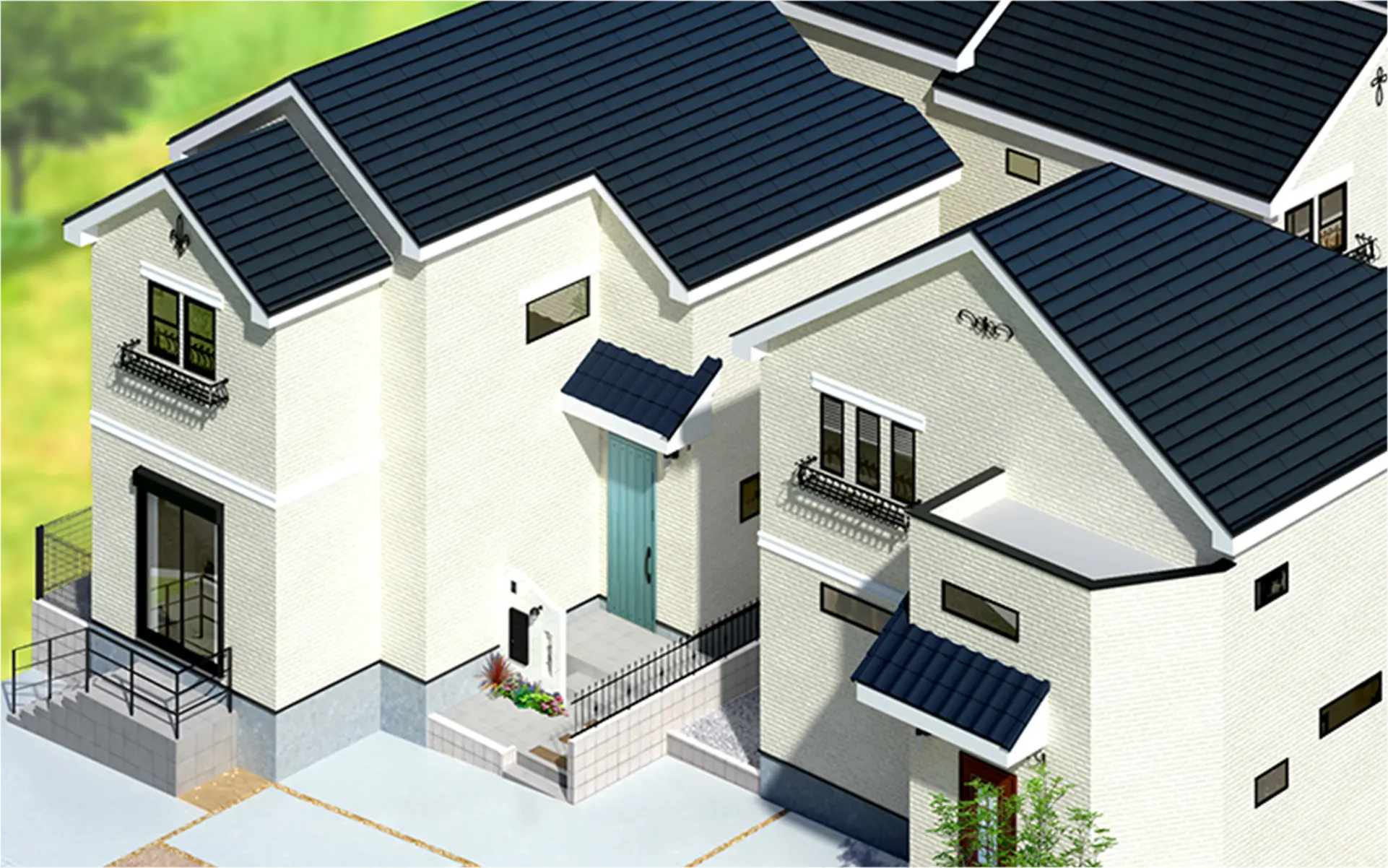 白壁と黒い瓦のコントラストが生む陰影の美しさ。外壁を彩るアイアン調の照明や装飾モールが、街に統一感と洗練された個性を与えます。どこから見ても調和が感じられる、南欧のやわらかな空気感をまとったファサードデザインです。