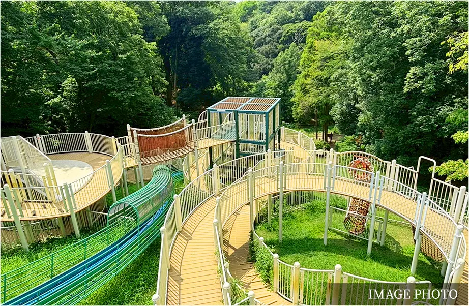 6〜12歳向けの冒険型アスレチックで、長いローラー滑り台や吊り橋、ロープ渡りなど、斜面を活かしたダイナミックな構造が魅力です。